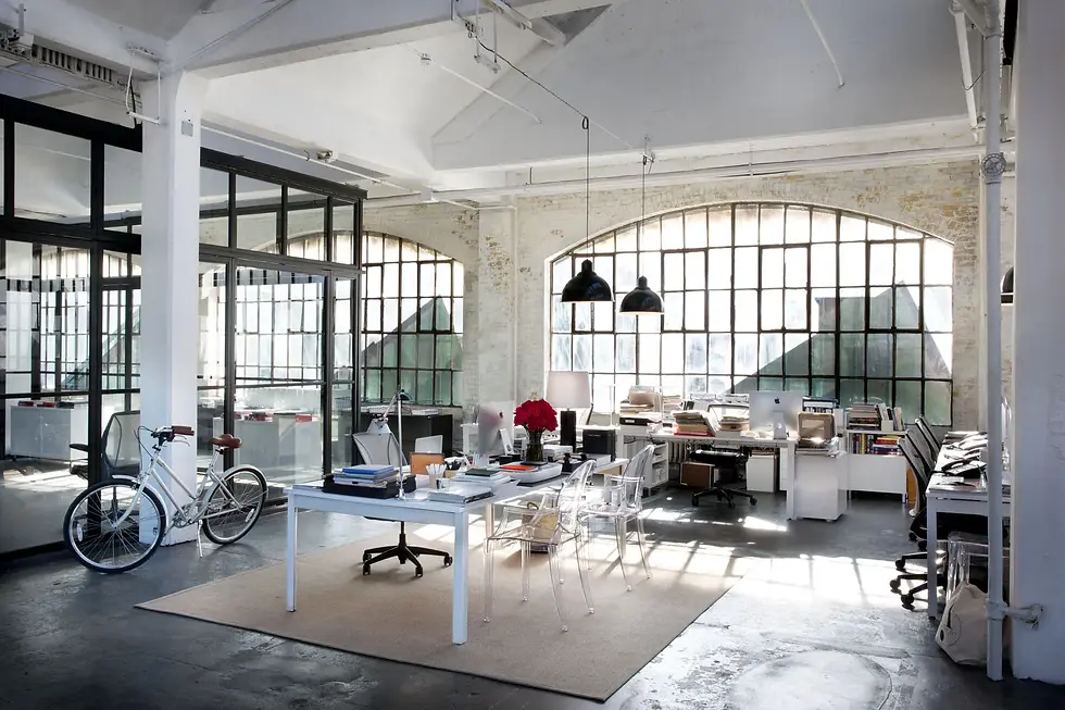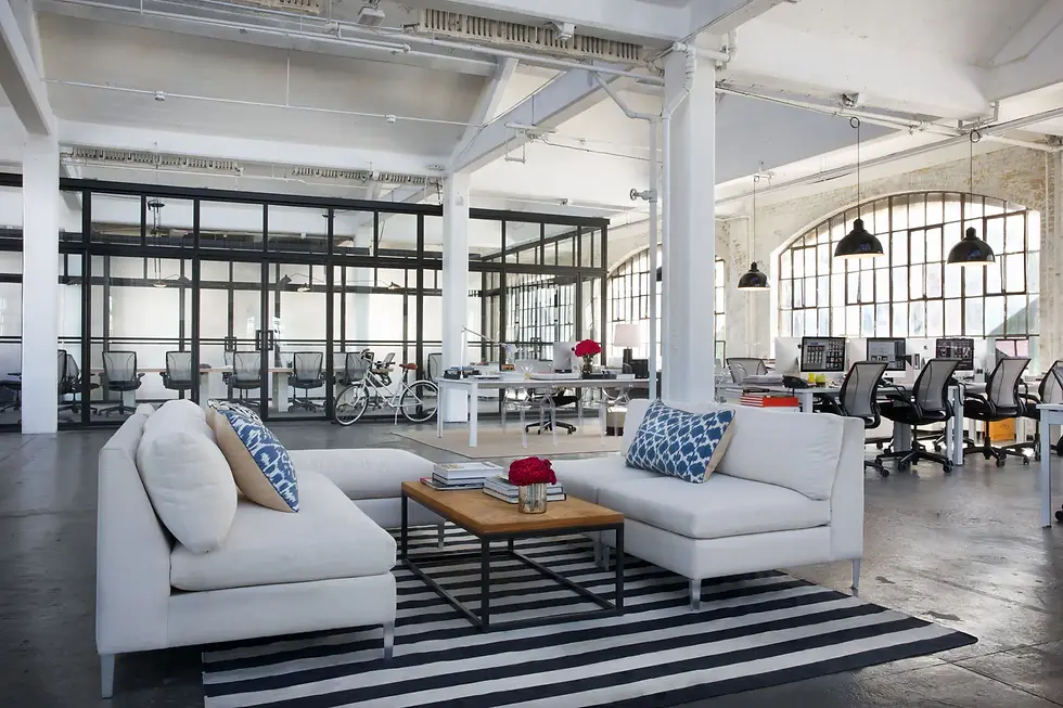 來到茱兒新創時裝公司辦公室,設計團隊打造出開放式玻璃隔間的會議室,公共空間放著 CB2 品牌的沙發。