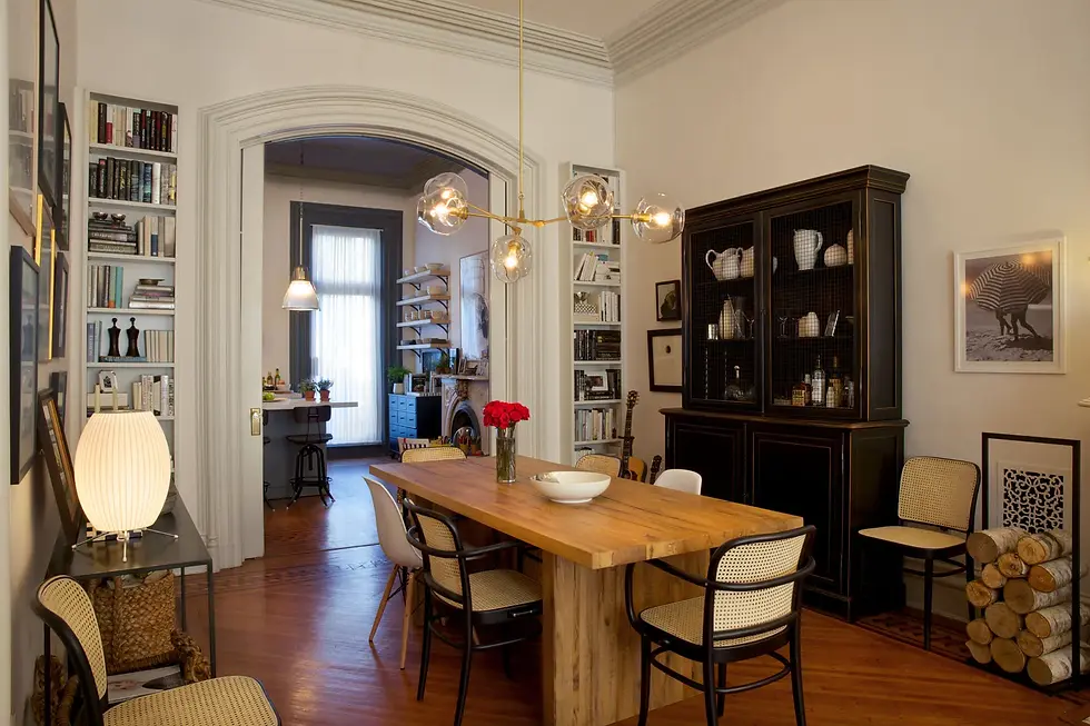 天花板的吊燈是美國知名燈飾設計師 Lindsey Adelman 的五燈分子吊燈,餐桌旁隨意擺放了不同款式的椅子,左邊的桌子上又放了義大利名設計師 George Nelson 的燈籠燈。